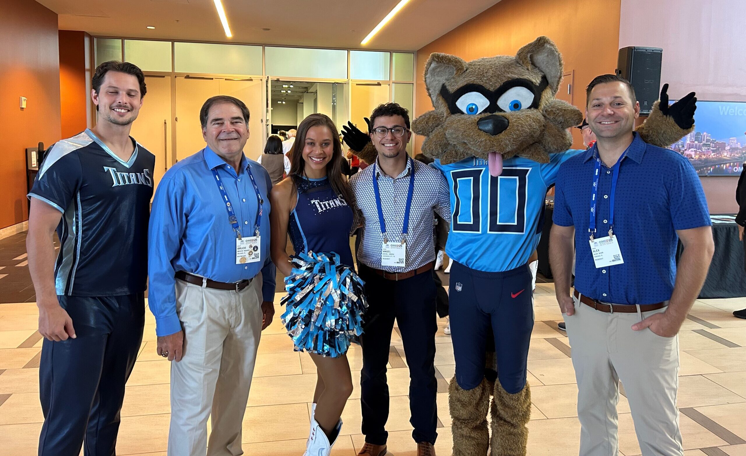 Dr. Rankin (second from left) poses with members of the Tennessee Titans cheer team and mascot T-Rac, along with Dr. Green and Dr. Sher.